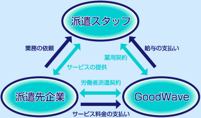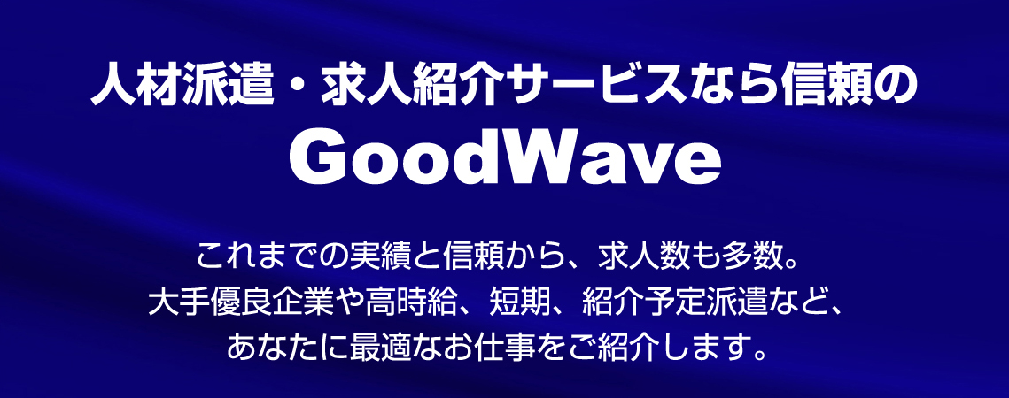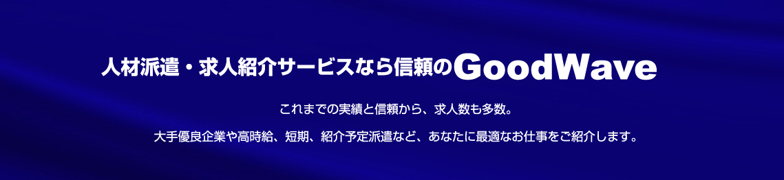 人材派遣とは、ご登録いただいた方に弊社の契約企業の中から条件とスキルにあったお仕事を紹介し、「派遣スタッフ」として働いていただくシステムです。 あなたのキャリアを一番ベストなカタチで発揮できるよう、 最適なお仕事を紹介します。 派遣スタッフの皆さまへの給与支払いや就業時の条件等の明示は、Good Waveが行い、社会保険や健康診断等の福利厚生も弊社の保障を受ける事が出来ます。